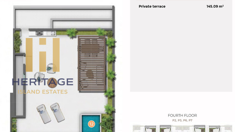 Квартира занимает третий этаж и имеет продуманную планировку: 3 спальни, 3 ванные комнаты, отдельная кладовая и светлая зона кухни-гостиной. Общая внутренняя площадь — 144.46 м², плюс уютная терраса 29.11 м², где можно спокойно завтракать или проводить вечера на свежем воздухе.